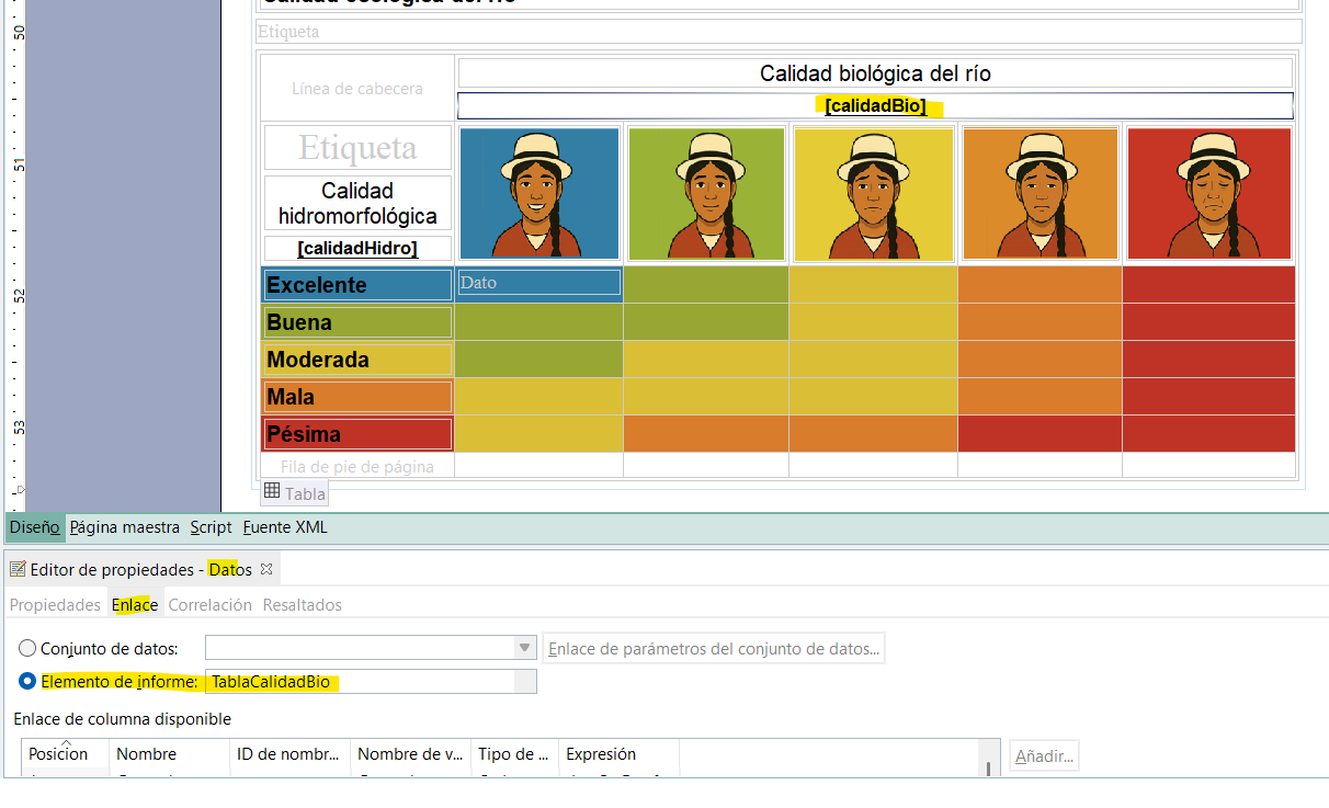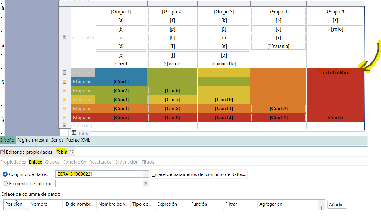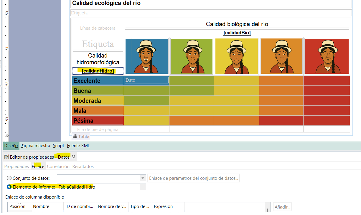 The issue is that when I try to write the conditional code in the third table, the variables calidadHidro and calidadBio do not appear as available fields, so I can’t reference them in the code editor.