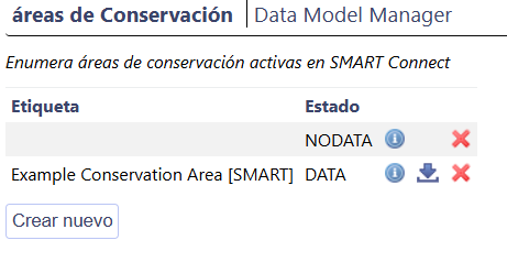 Esto me sucede para 2 áreas de conservación distintas. Actualmente mi servidor no tiene áreas de conservación disponibles, como se muestra en la imagen, se refleja solamente una, sin nombre y sin datos