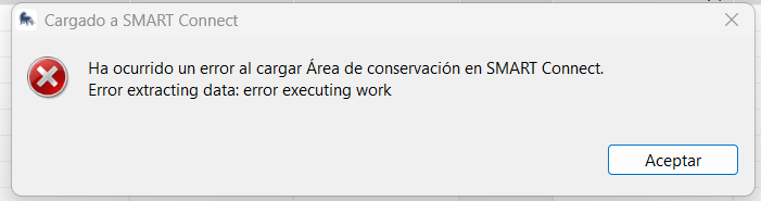 Anteriormente ya utilizaba smart connect, incluso trabajé con un proyecto utilizando connect, el problema es que no sincronizaba los cambios, intento cargar nuevamente las áreas de conservación pero no funciona, me aparece el siguiente mensaje