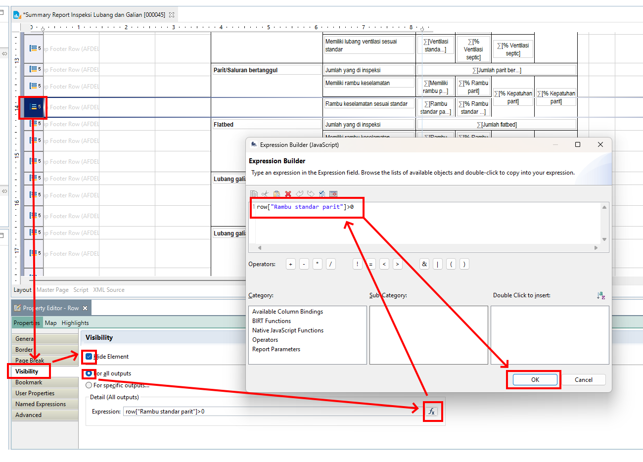 In Reporting, in the “Outline” panel, I first loaded in a query into my data sets. I then created a “Data Cube” to import this data query. I added a “Cross Tab” to the report and dropped the “Data Cube” in the “Cross Tab”.