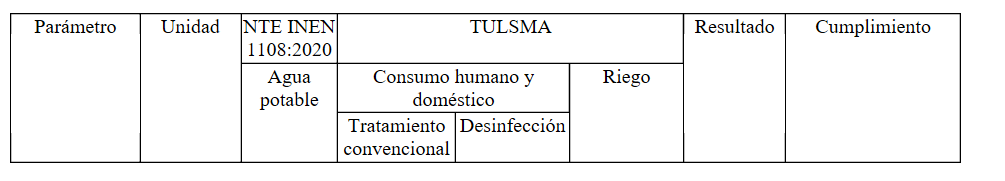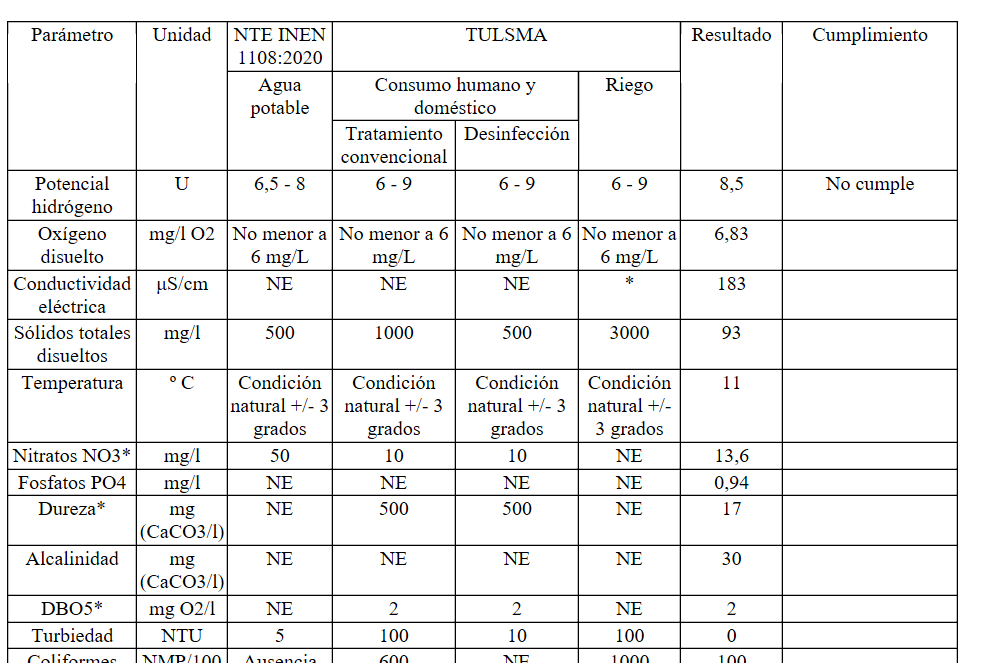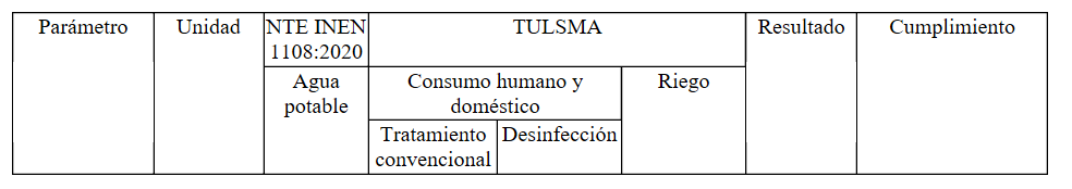 I’m generating a report that shows these water-quality parameters and evaluates whether they meet the permitted limits for the chosen use type (6. Tipo de uso).