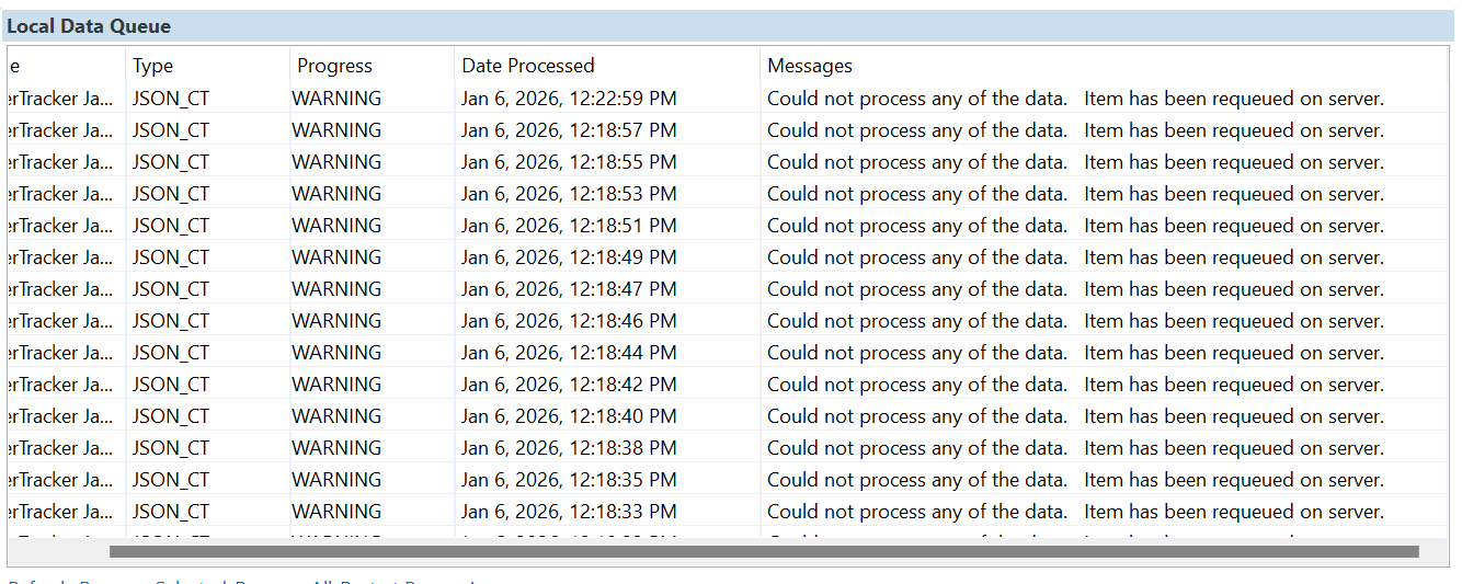 I am trying to download data from the connect queue, but the warning message is repeatedly shown with the message ‘Could not process any of the data. Item has been requeued on the server’. Is there a way to fix this such that the data can be downloaded?